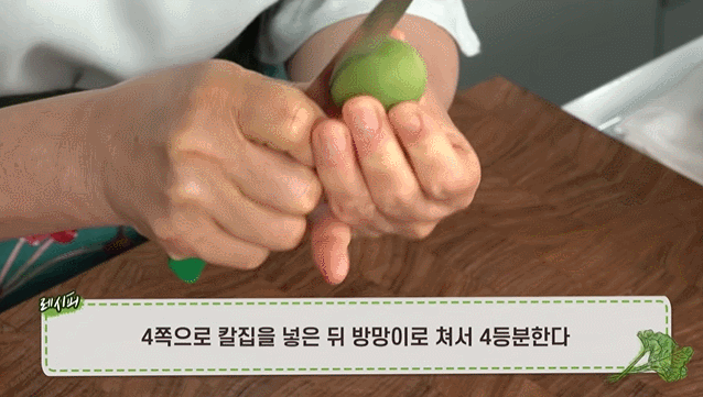 (3) 네 쪽으로 칼집을 넣고 방망이로 쳐서 4등분 한다.