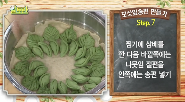 (7) 찜기에 삼베를 깐 다음 바깥쪽에는 나뭇잎 절편을, 안쪽에는 송편을 넣는다.