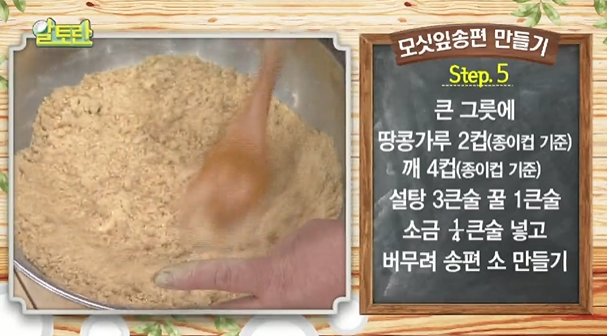 (5) 큰 그릇에 땅콩가루 2컵, 깨 4컵, 설탕 3큰술, 꿀1큰술, 소금 1/4큰술 넣고 버무려 속재료를 만든다.