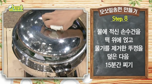 (8) 물에 적신 손수건을 떡 위에 얹고 물기를 제거한 뚜껑을 덮은 다음 15분간 찐다
