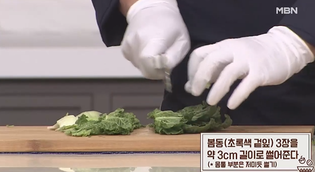 (1) 봄동 (초록색 겉임) 3장을 약 3cm 길이로 썬다.
