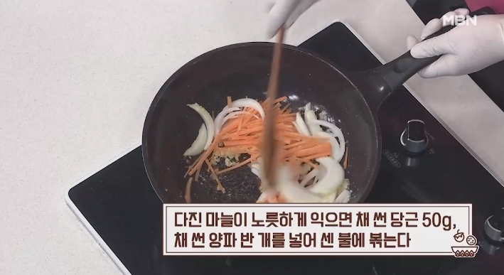 (5) 다진 마늘이 노릇하게 익을때 쯤 채 썬 당근 50g, 채 썬 양파 반개 넣어 센 불에 볶는다.