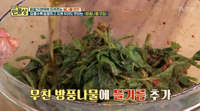 방풍나물 요리법 정말 간단하죠? 방풍나물을 손질하고 살짝 데친후에 양념장에 잘 버무려주면 완성입니다. 이보은 요리연구가님은 '들기름'으로 마무리를 하는데요. 여기서 '참기름'을 사용은 추천하지 않습니다. 참기름의 강한 향이 방풍나물의 향을 이겨버리기 때문인데요. 반대로 들기름은 은은한 고소한 향이기때문에 방풍나물과 조합이 좋습니다. 참기름 대신 꼭 들기름을 사용하시기 바랄게요.