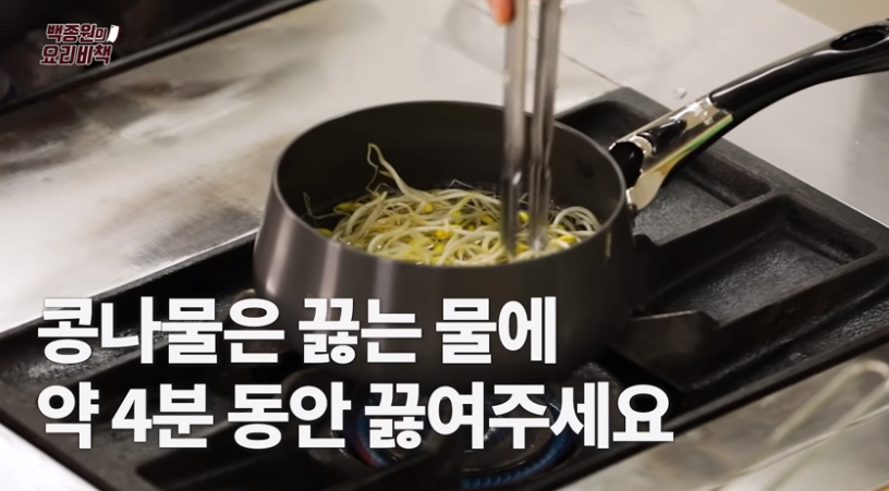 (6) 콩나물을 끓는 물에 약 4분 삶은 후, 찬물에 헹궈 물기를 제거한다.
