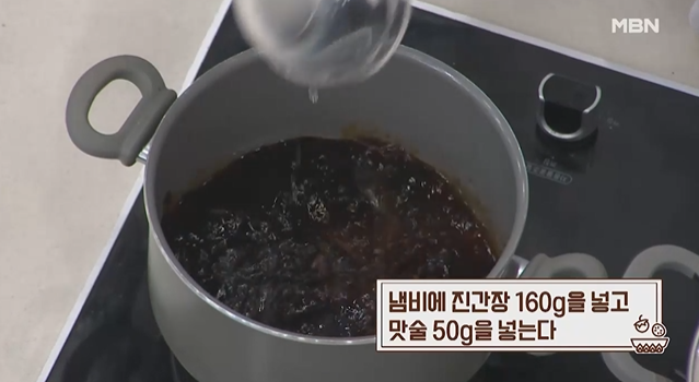 (5) 냄비에 진간장 160g을 넣고 맛술 50g, 참치액 5큰술 넣는다.