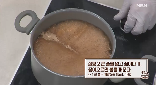 (6) 설탕 2큰술 넣고 끓이다가, 끓어오르면 불을 끈다.