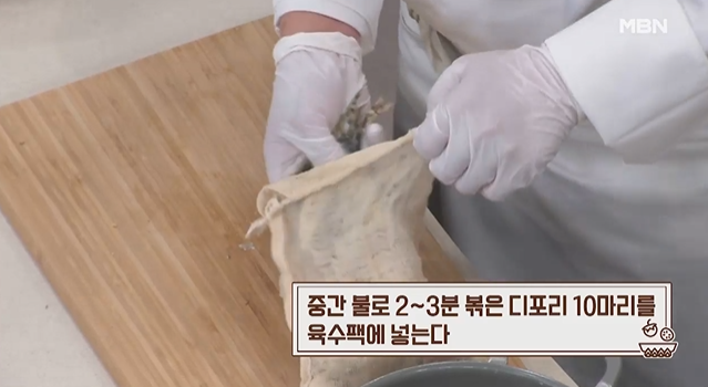 (11) 대파 뿌리 5개, 중불로 볶은 디포리 10마리를 육수팩에 넣는다.
