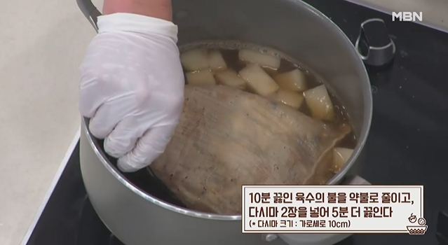 (17) 10분 끓인 육수의 불을 약불로 줄이고, 다시마 2장을 넣어 5분 떠 끓인다.