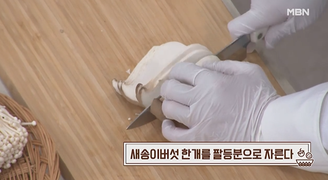 (4) 새송이버섯 한 개를 팔등분으로 자른다.
