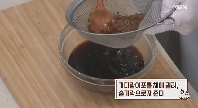 (8) 가다랑어포를 체에 걸러 숟가락으로 짜준다.