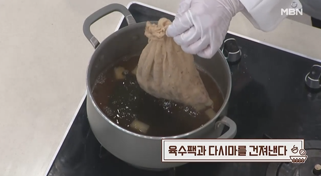 (12) 육수팩을 냄비에 넣어 끓인다.