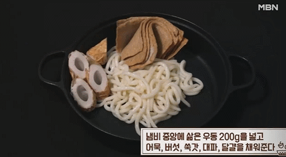 (20) 냄비 중앙에 삶은 우동 200g을 넣고 어묵, 버섯, 쑥갓, 대파, 달걀을 채워준다.