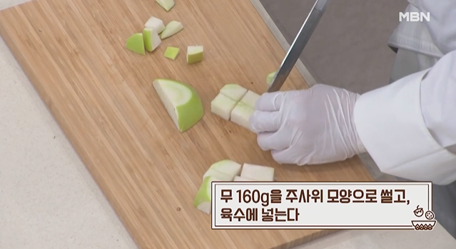 (13) 무 160g 을 주사위 모양으로 썰고, 육수에 넣는다.