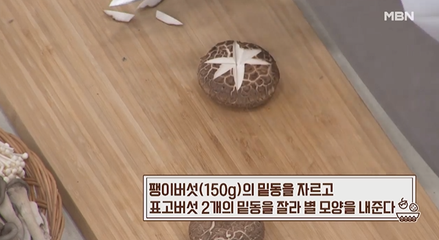(2) 팽이버섯 (150g)의 밑동을 자르고 표고버섯 2개의 밑동을 잘라 별모양을 낸다.