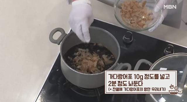 (7) 가다랑어포 10g 정도를 넣고 2분 정도 놔둔다.