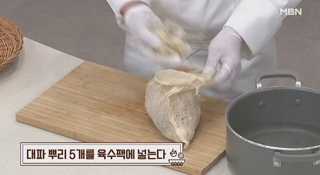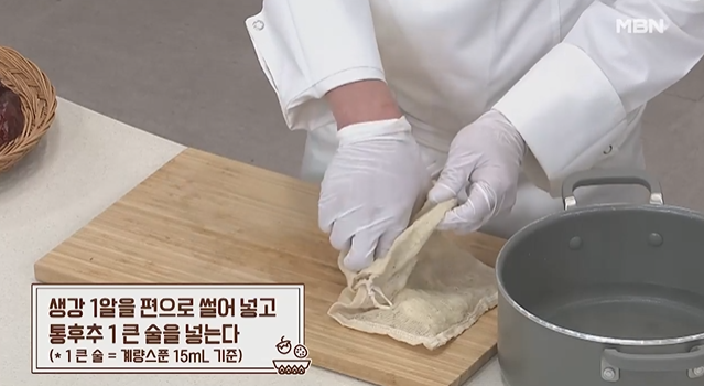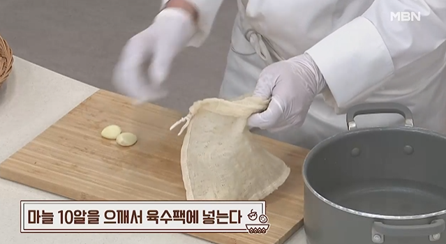 (10) 으깬마늘 10알, 편썬 생강 1알, 통후추 1큰술, 반 자른 건고추 3개, 양파 껍질을 육수팩에 넣는다.