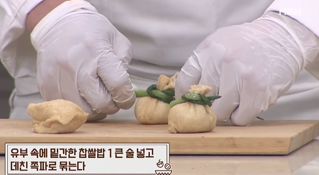 (16) 유부 속에 밑간한 찹쌀밥 1큰술 넣고 데친 쪽파로 묶는다.