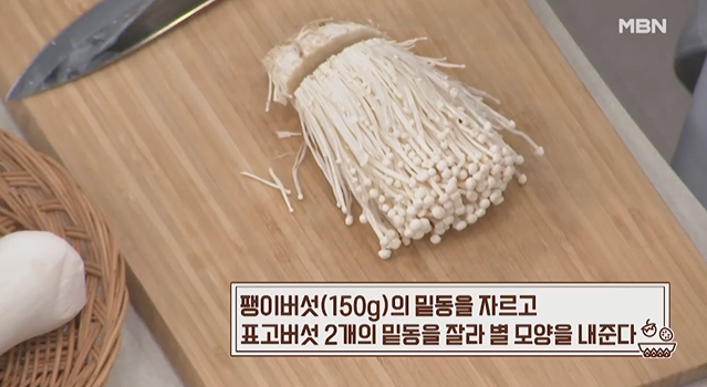 (2) 팽이버섯 (150g)의 밑동을 자르고 표고버섯 2개의 밑동을 잘라 별모양을 낸다.