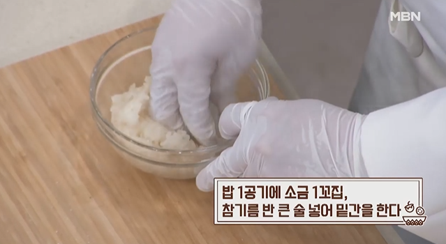 (15) 밥 1공기에 소금 1꼬집, 참기름 반큰술 넣어 밑간한다.