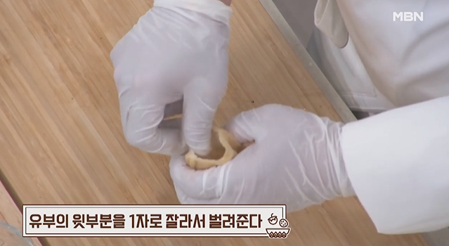 (14) 유부의 윗부분을 1자로 잘라서 벌려준다.