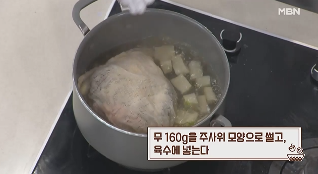 (13) 무 160g 을 주사위 모양으로 썰고, 육수에 넣는다.