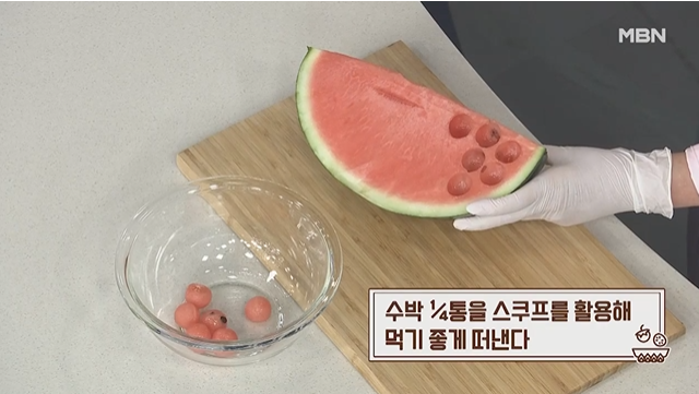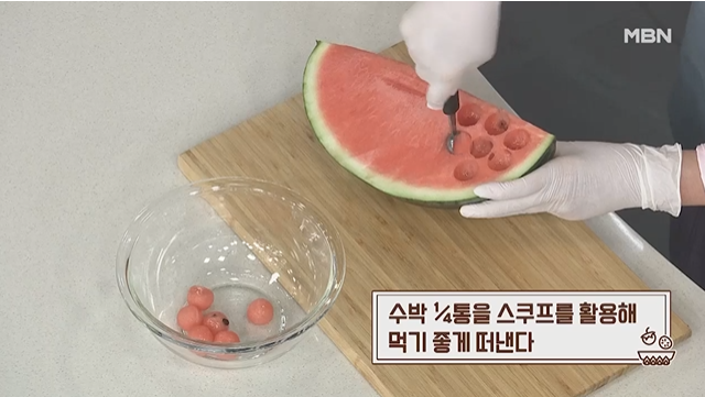 (1) 수박 1/4통을 스쿠프를 활용해 먹기 좋게 떠낸다.