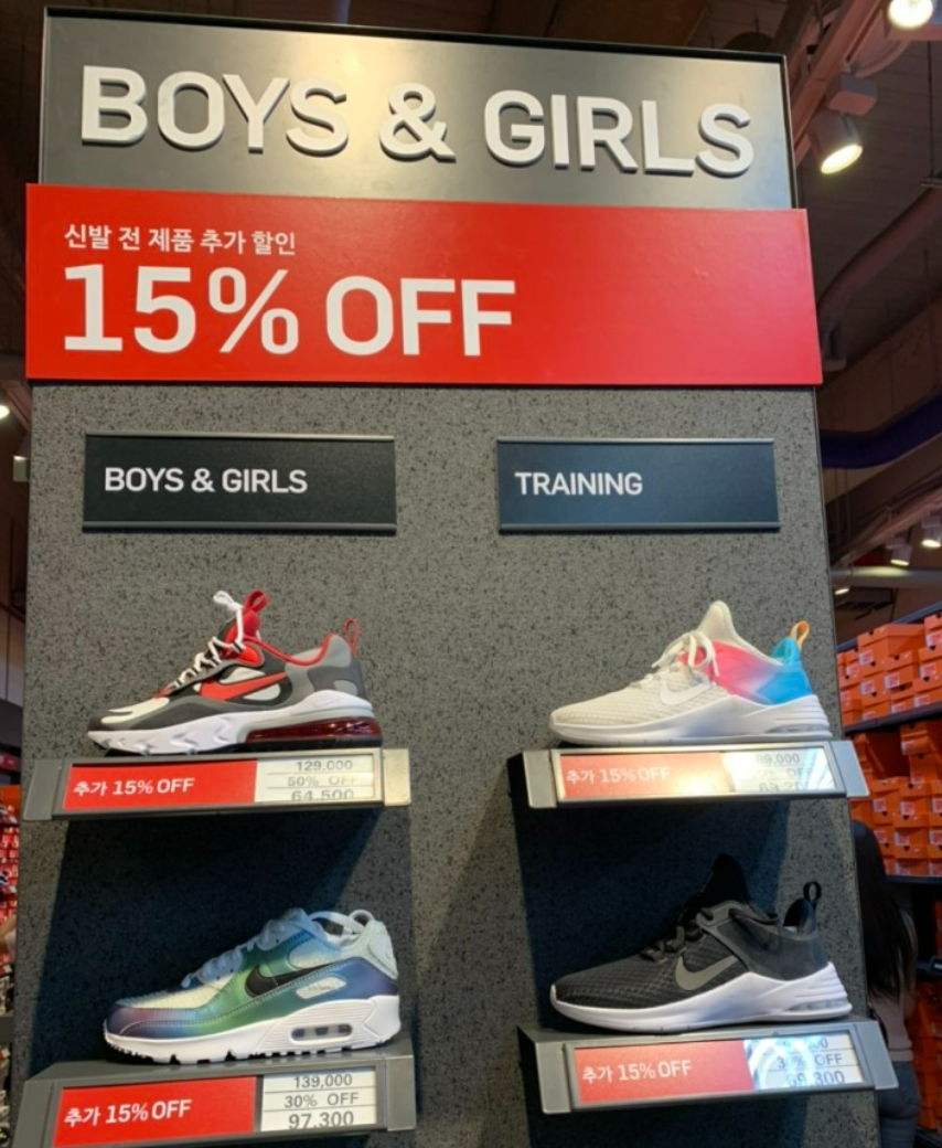 시흥 프리미엄 아울렛 나이키 매장에서는 항시 세일을하고, 한시적으로 추가 할인을 해주는 행사들을 진행합니다.