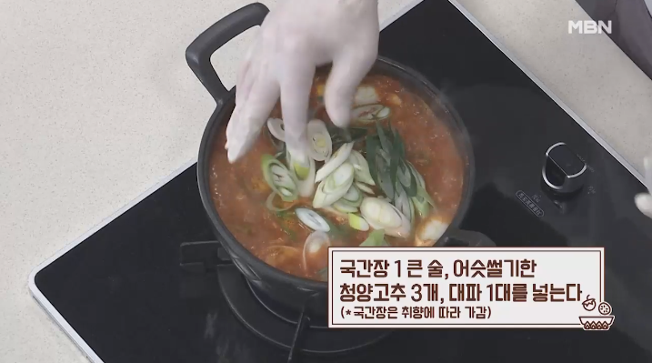 (8) 국간장 1큰술, 어슷썬 청양고추 3개, 대파 1대 넣는다.