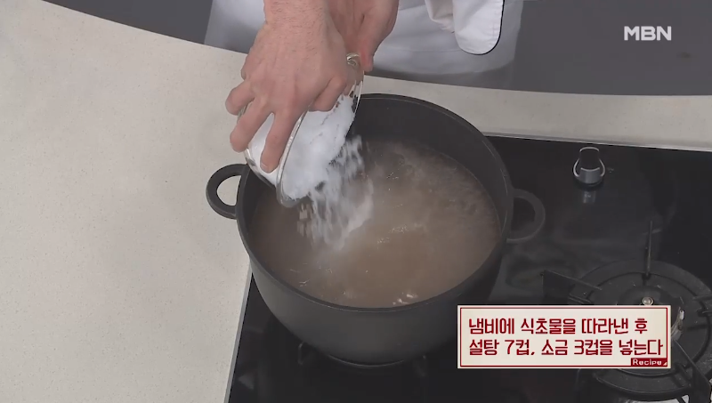 (4) 일주일 뒤 냄비에 식초물을 따라내고, 설탕 7컵, 소금 3컵을 넣는다.