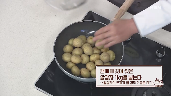 (1) 후라이팬에 깨끗이 씻은 알감자 1kg을 넣는다.