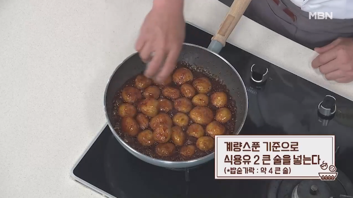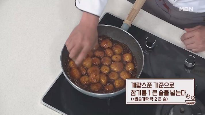 물엿에 먼저 조리면 삼투압에 의해서 수분이 빠져나와 식감이 쫀득해저요!