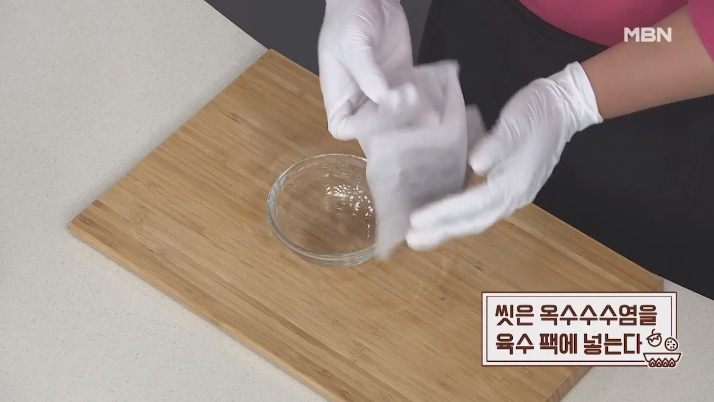 (4) 씻은 옥수수염을 육수팩에 넣는다.