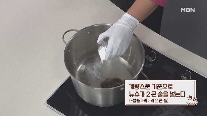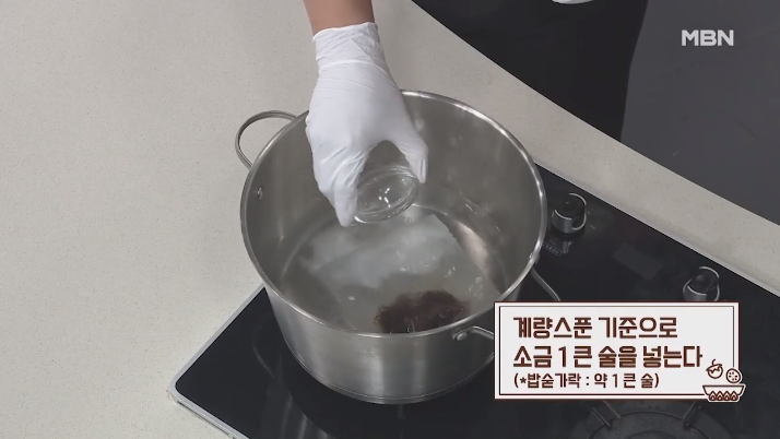 (6) 계량스푼 기준으로 뉴슈가 2큰술, 소금 1큰술 넣는다.