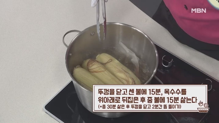 (8) 뚜껑을 잘 닫고 강 불에 15분, 옥수수를 위아래로 뒤집은 후 중 불에 15분 삶는다.