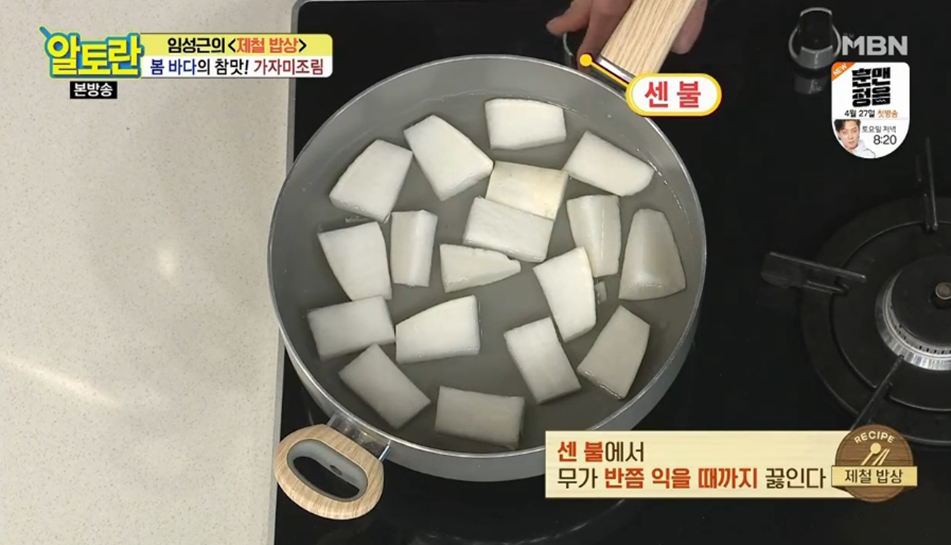 (25) 센 불에서 무가 반쯤 익을 때까지 끓인다.