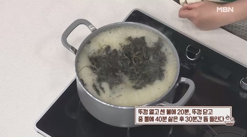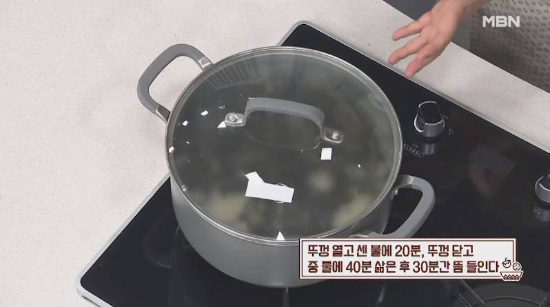 (3) 뚜껑 열고 센 불에 20분, 뚜껑닫고 중불에 40분 삶고, 30분간 뜸들인다.