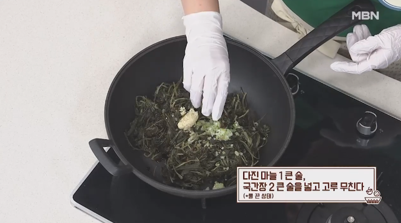 (7) 다진마늘 1큰술, 국간장 2큰술을 넣고 골고루 무친다.