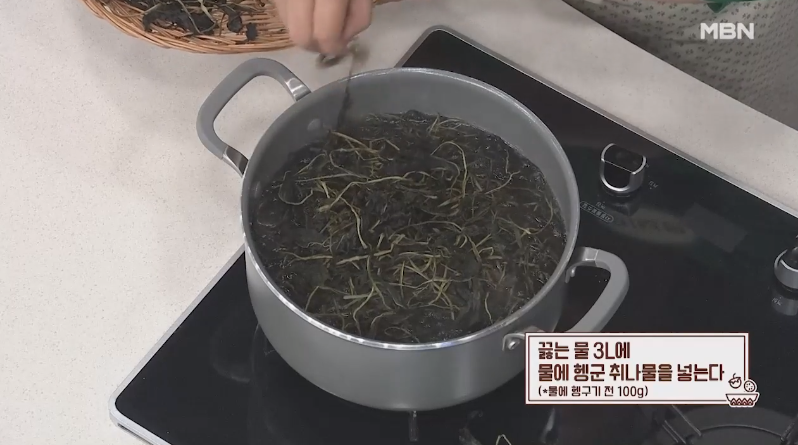 (1) 끓는 물 3L에 물에 헹군 취나물을 넣는다.