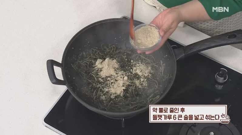 (10) 약 불로 줄인 후 들깻가루 6큰술 넣고, 불을 끈 후 들기름 1큰술 넣는다.