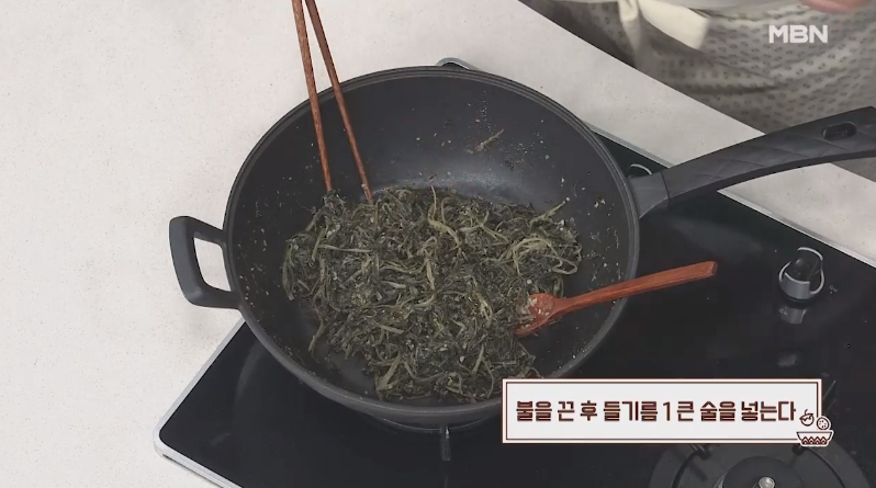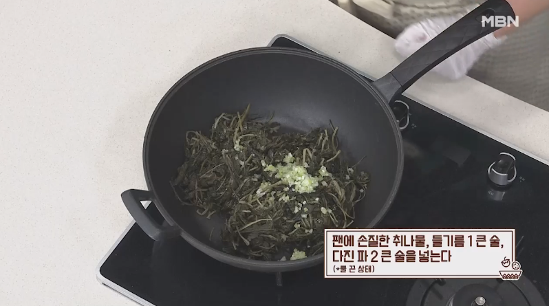 (6) 팬에 손질한 취나물, 들기름 1큰술, 다진 파 2큰술 넣는다.