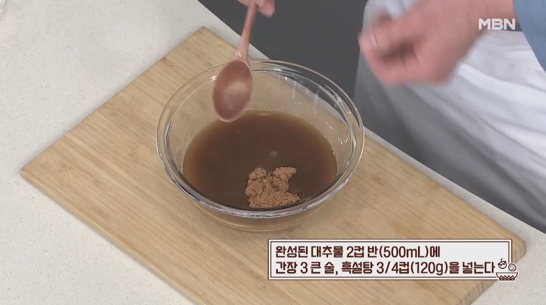 (4) 완성된 대추물 2컵 반(500mL)에 간장 3큰술, 흑설탕 3/4컵(120g)을 넣는다.