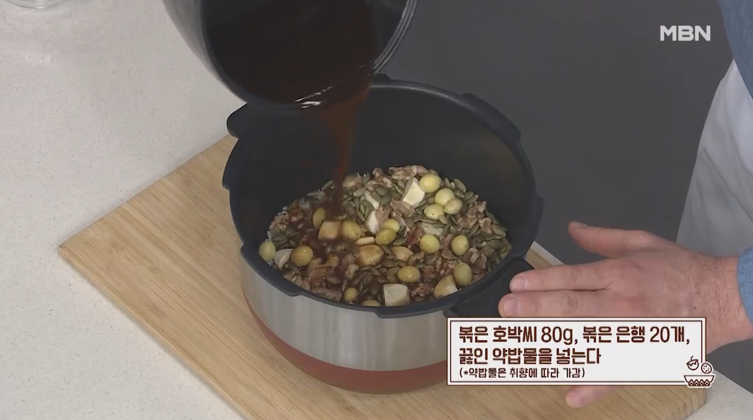(7) 볶은 호박씨 80g, 볶은 은행 20개, 끓인 약밥물을 넣는다.