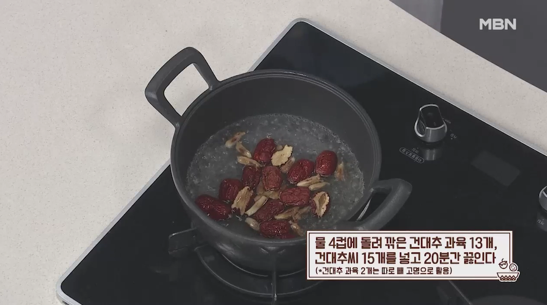 (1) 물 4컵에 돌려 깍은 건대추 과육 13개, 건대추 15개를 넣고 20분간 끓인다.