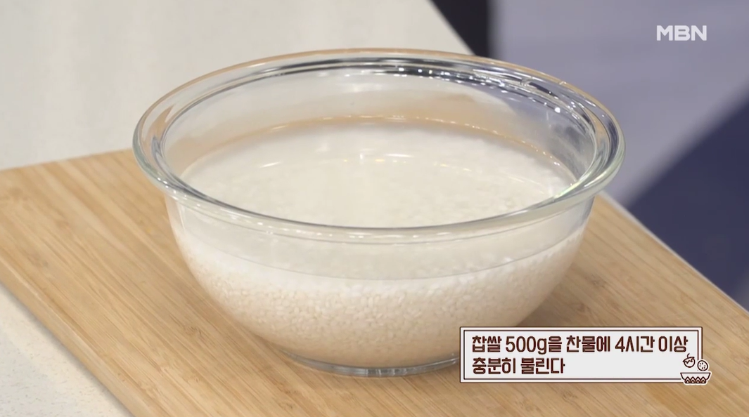 (0) 찹쌀 500g을 찬물에 4시간 이상 충분히 불려서 준비한다.