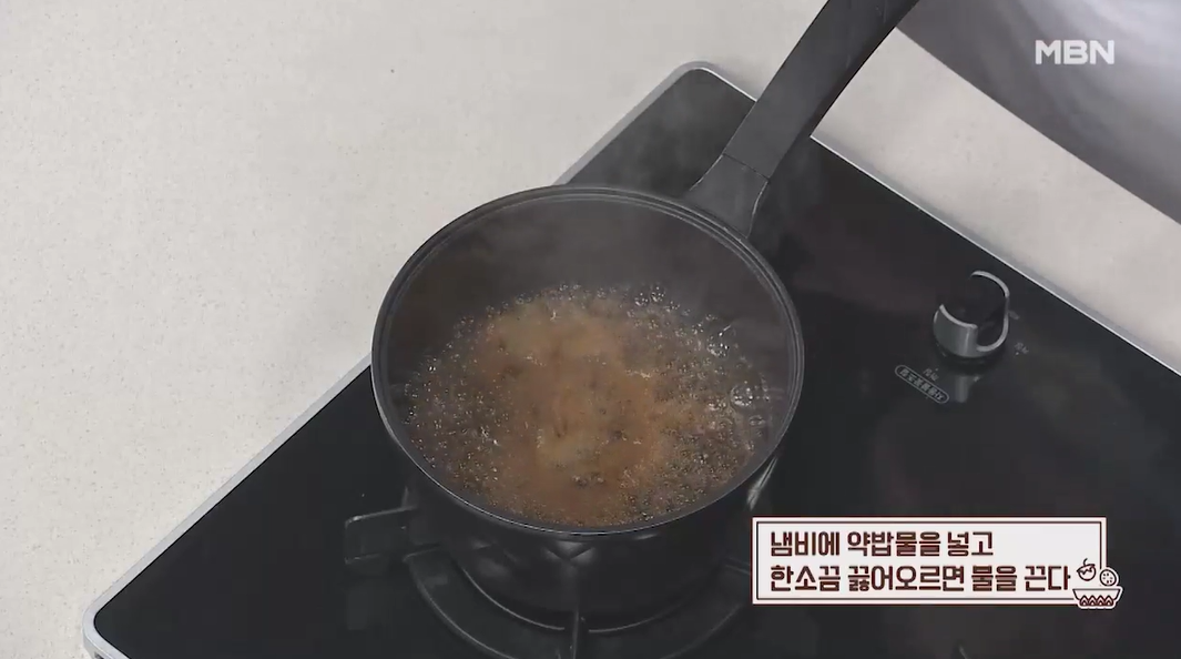 (5) 냄비에 약밥물을 넣고 한소끔 끓어오르면 불을 끈다.
