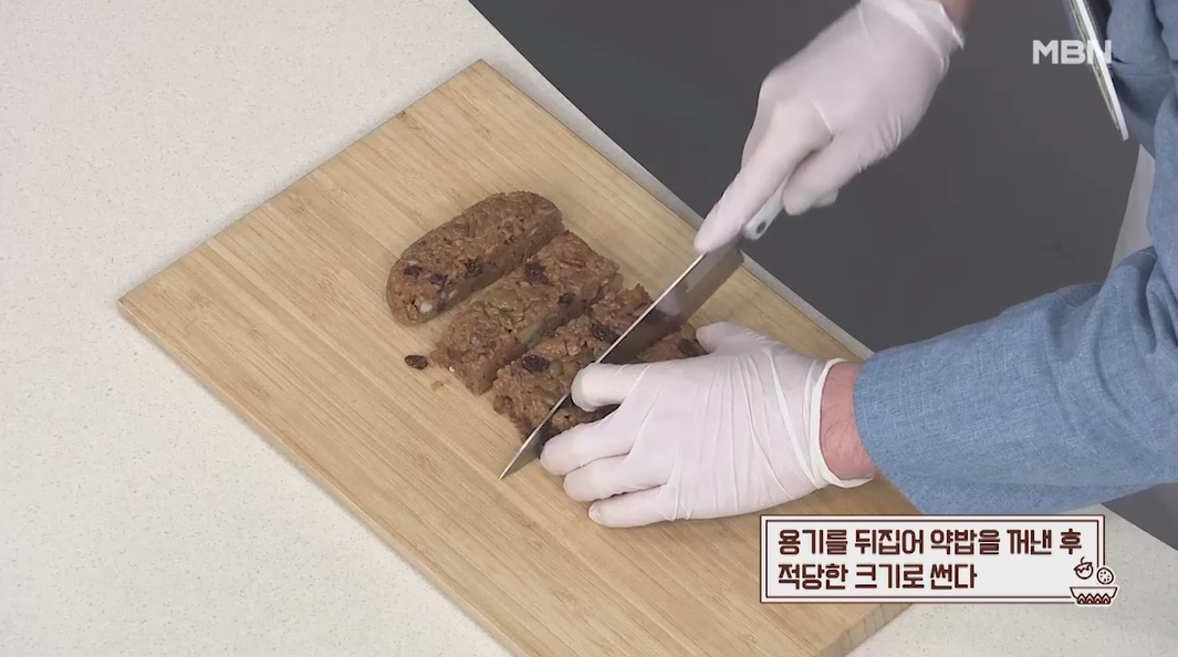 (16) 용기를 뒤집어 약밥을 꺼낸 후 적당한 크기로 썰어준다.