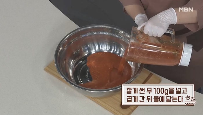 (10) 믹서에 찬밥 3큰술, 새우젓 3큰술, 멸치액젓 2큰술, 잘게 썬 무 100g을 넣고 곱게 간 뒤 볼에 담는다.