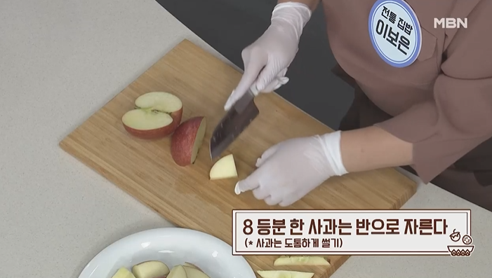 (13) 사과 2개는 껍질째 각 8등분 한 후 씨를 제거한다.