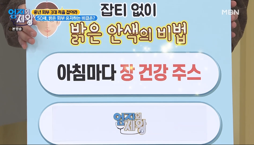 이런 동안미모의 박태연 씨의 밝은 안색 비법은 바로 아침마다 '장건강 주스'를 섭취하는 것입니다. 장이 건강하면 피부도 좋아지고 젊게 살 수 있다고 들은 박태연씨는 꾸준히 아침마다 장건강 쥬스를 섭취하신다고 합니다. 엄지의 제왕 장건강 주스에 대해서 자세히 알아볼게요.