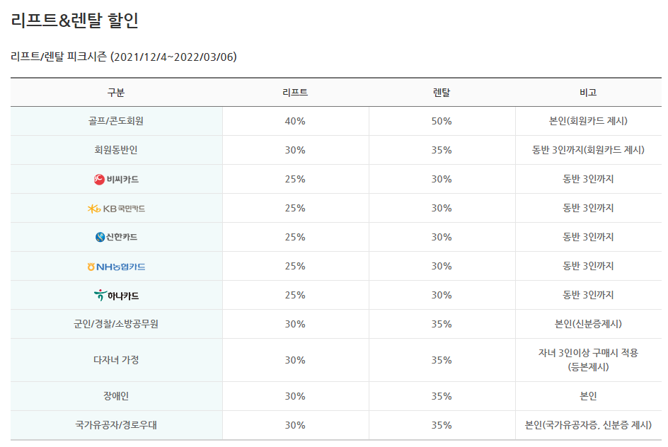용평스키장 리프트권 할인카드는 비씨카드, kb국민카드, 신한카드, NH농협카드, 하나카드 다섯개의 카드사가 있으며, 군인,경찰, 소방공무원을 위한 할인과 다자녀가정, 장애인, 국가유공자/경로우대 할인혜택이 있습니다.